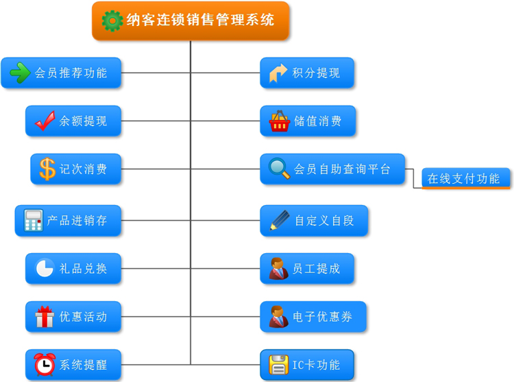 从功能上分,可支持储值卡、折扣卡、计次卡、积分卡、计时卡等多种会员卡形式。