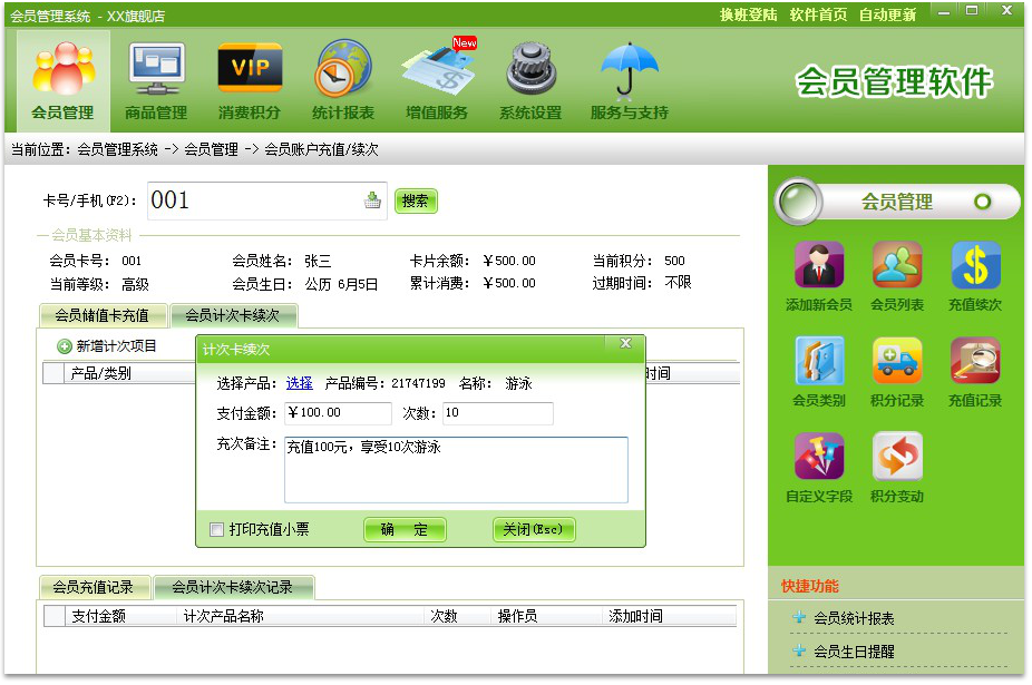 充值、消费、余额等短信发送到会员手机上。独有的会员短信模板一键发送您想发送的任何手机号,让短信变成一个成本低质量高的推广工具。