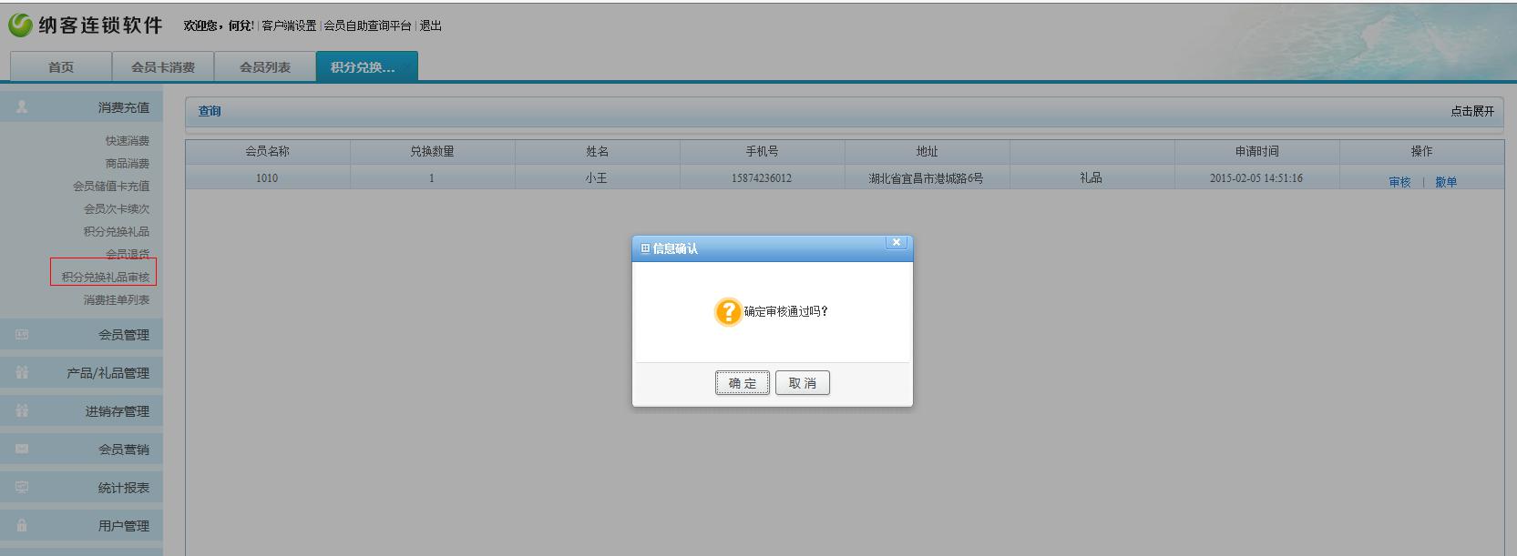 商在系统中会收到这个会员兑换批量的申请,进行审核,审核通过了按照会员的收件姓名,电话和地址寄给改该会员。如图: