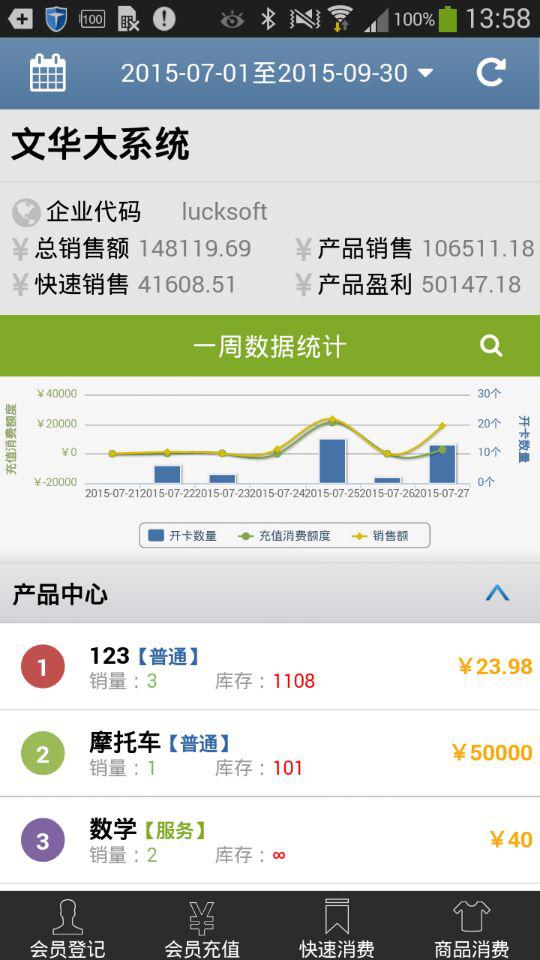 1.登录页,不仅可以一目了然的了解整体的销售额度。同时还可以根据一周数据统计表大体的了解整周商的开卡数量,充值消费额度以及销售额。
