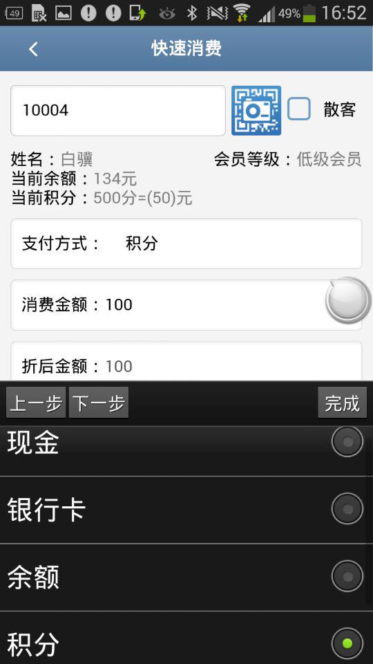 4.用手机APP操作快速消费(直接输入金额消费)同时还可以选择是使用现金,银行卡,充值余额以及积分来进行结算。非常的灵活方便。
