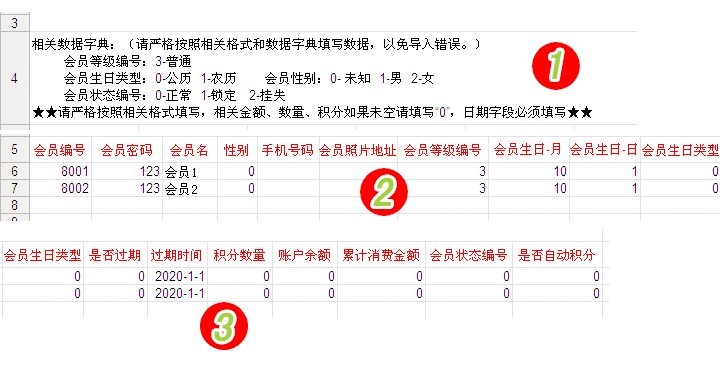 “会员生日-月”“会员生日-日”:会员生日的月份和日期,必须填写数字,并且能表示一个正确的日期;