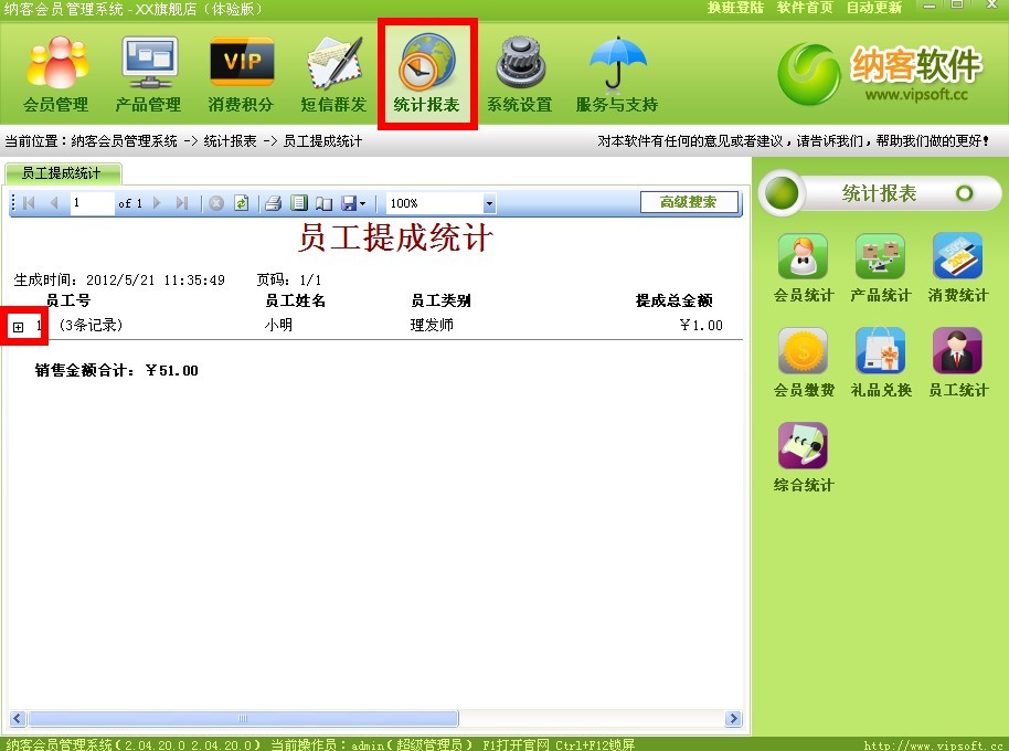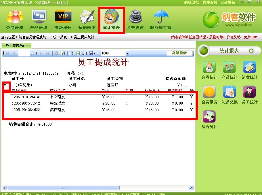 然后按照之前的文章来给相应的员工提成(//www.bhphwj.com/article/201205/1160.html)操作完成之后我们就来看看怎样在统计报表中体现员工的工作量啦