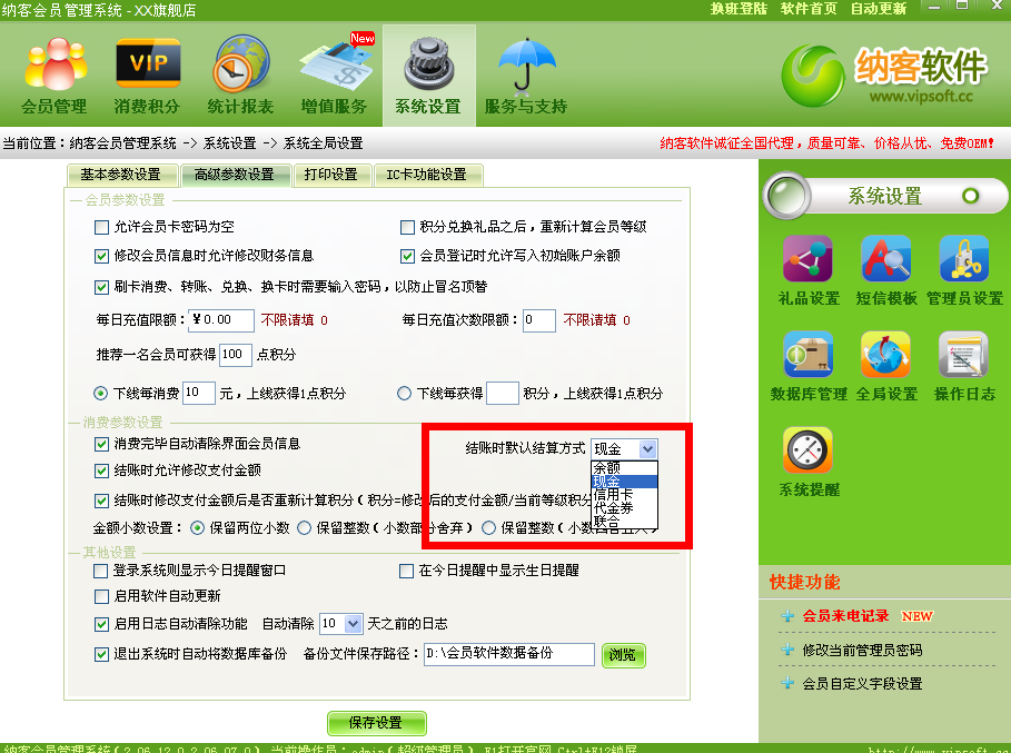 还有就是关于之前有很多纳客会员管理软件的使用者提出的一个能不能在消费支付方式里面有一个默认的设置,这个问题咱们纳客会员管理软件现在已经完美解决,具体操作方式见下图。