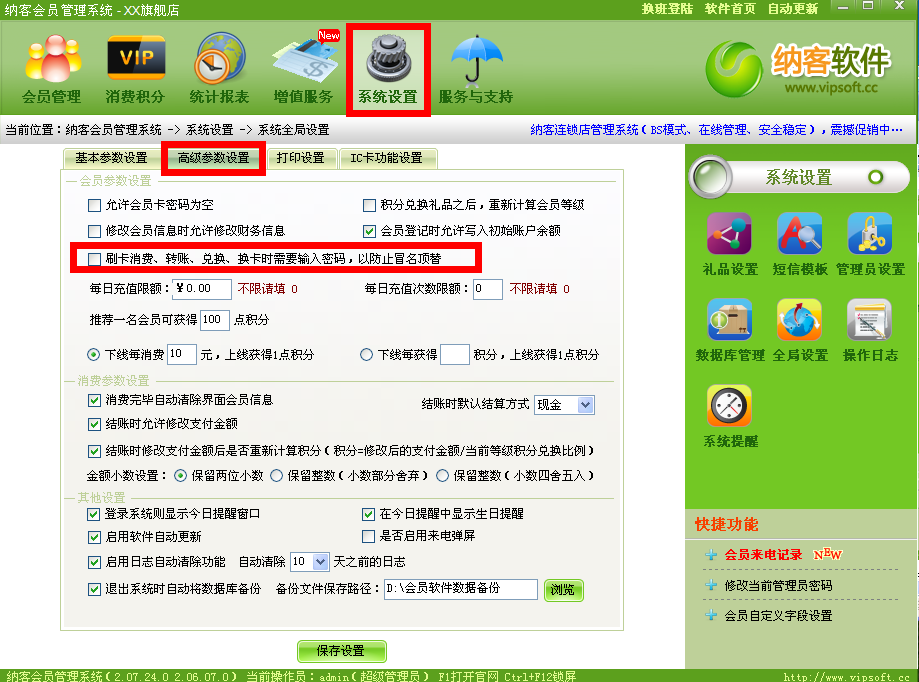 在这里给大统一解答下,会员消费密码可以不设置。在纳客会员管理软件中的系统设置中设置一下,如下图: