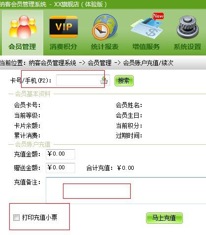 2.充值:输入会员卡号或手机号就可以显示会员所有信息,然后对其充值,在备注中可以特别备注,更加人性化的是,在会员充值后,还可以一会员打印充值凭证。