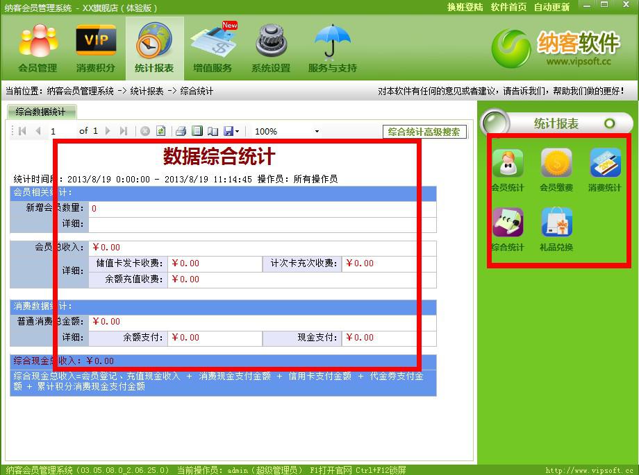 4.统计报表: 在统计表报中,商可以对整个店面的营业状况一目了然,店铺会员总数、新曾会员、会员储值总额、消费总额等等一切信息