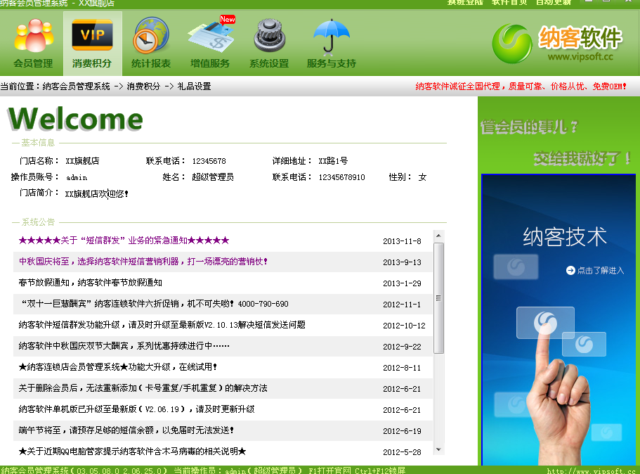 纳客会员卡管理系统体验地址:http://www.lucksoft.cn/download.html