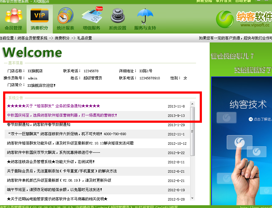 红色框框内是纳客会员管理软件发布的关于软件的升,特大重要的通知,软件的活动公告 等都在这里给大公布出来。小编也希望大在登录软件的时候能够随带看一下这里的公告情况。