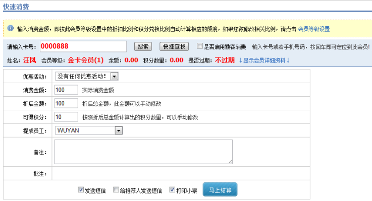 3、 储值卡,储值支付后,系统自动发送短信提醒顾客消费金额,让顾客感觉到您的服务。