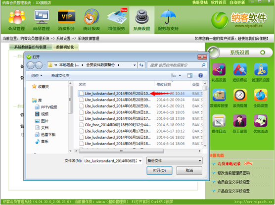 如果您要恢复数据的话,在我们纳客会员管理软件系统设置恢复路径见上图然后在文件夹里面选择一后一个备份的数据,这样,您的所有数据就恢复到那个相应的备份文件时间的数据了当然,我们纳客会员管理软件在每次您退出的时候都会自动给您备份一个文件在备份的文件夹里面的,您要恢复的时候只需要点击一后的时间。操作如上图那样,您的会员数据就永远不会丢失了。