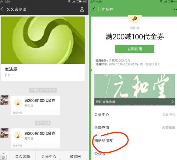 通过微信发送的电子优惠券,微信公众号会推送卡券给每个微信会员。会员点击领取后可以赠送给朋友进行使用。然后会员到店消费的时候,可以直接出示卡券二维码给商家扫码核销。