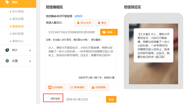 商家还可以定时发送短信消息,比如在节假日即将来临之际,预先设定好短信消息,在节日当天就会自动群发设定好的短信内容,大大的提高了管理人员的工作效率。