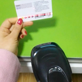将扫描器的感应区对准卡片的条码(扫描器红色感应线穿过条码线)