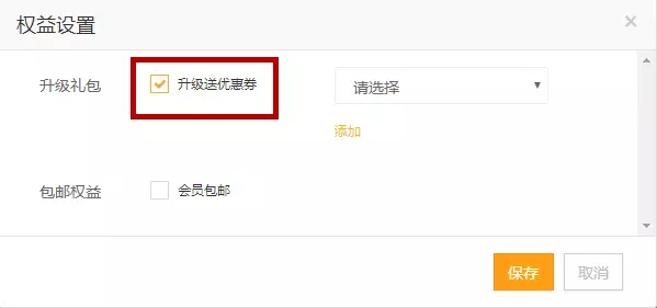 在【营销】→【营销中心】→【活动营销】→【会员权益】界面中,商可以选择会员达到哪个等的时候获得优惠券。