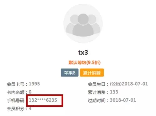 在【收银】→【快速消费】界面,和其他消费、充值、充次的会员信息中,电话号码将隐藏中间四位数,很好的保护了会员隐私。