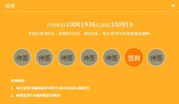 会员在主页签到,每天都能随机获得6积分、10积分,或者10条短信。连续签到7天,再得50积分。