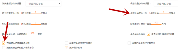 商家可在【设置】→【系统设置】→【系统参数】→【消费设置】界面中,设置余额兑换现金比例。通过勾选“充值时手动修改赠送金额”,并且在页面底部存,开启此功能。