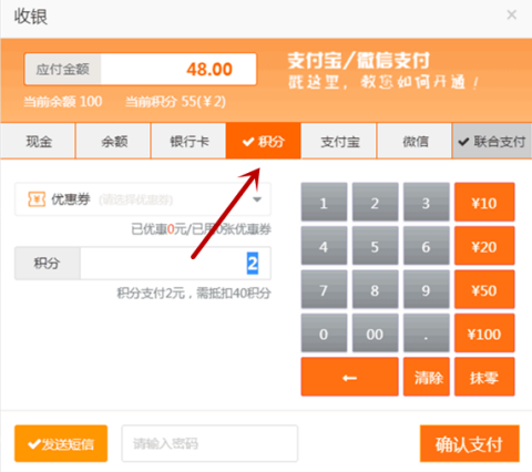 在【收银】→【快速消费】→【结账】界面中,新增积分支付功能。