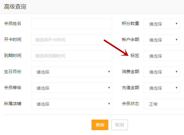 在【营销】→【短信发送】→【添加会员】→【高查询】界面中新增标签查询功能。