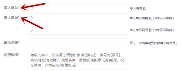 在【营销】→【营销中心】→【活动营销】→【电子优惠券】→【新增优惠券】界面中,新增了每人限领的张数、单人单日限用的张数。