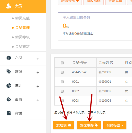 在【会员】→【会员管理】界面中的会员生日提醒,和【会员】→【会员管理】界面中的发短信和发优惠券,这三个功能管理员可以直接发送,操作员发送需要管理员授权。