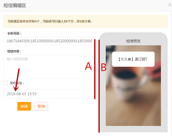 在【会员】→【会员等】界面发送短信时,优化前,A、B两条边框重合,短信发送时间会延迟1~5分钟;优化后,A、B两条边框分开,更加美观,短信即时发送。