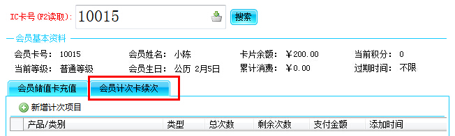 服务与支持1、点击“会员管理”主菜单,然后选择“充值续次”子菜单,会调出会员充值窗口,选择“会员计次卡续次“子菜单,输入会员卡号,如下图: