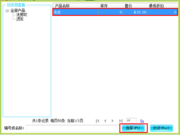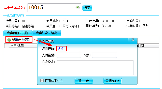 4、点击左边的产品类别找到相应的产品,然以后点击“选择”按钮,页面回到计次卡续次页面,如下图: