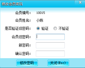 点击“会员管理”主菜单,然后选择“会员列表”子菜单,在会员列表中点击右键,选择“修改会员密码”菜单,即可调出修改密码窗口,如下图: