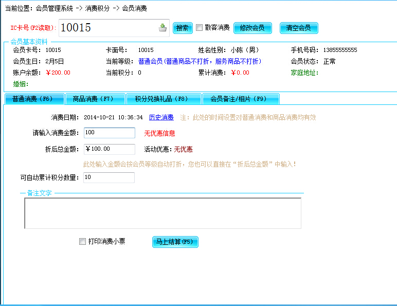 服务与支持点击“消费积分”主菜单,然后选择“会员消费”子菜单,即可调出会员消费窗口,如下图: