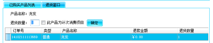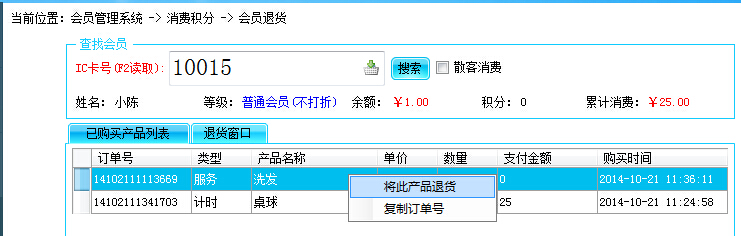 1.选择要退货的会员信息,系统会调出会员的消费订单;