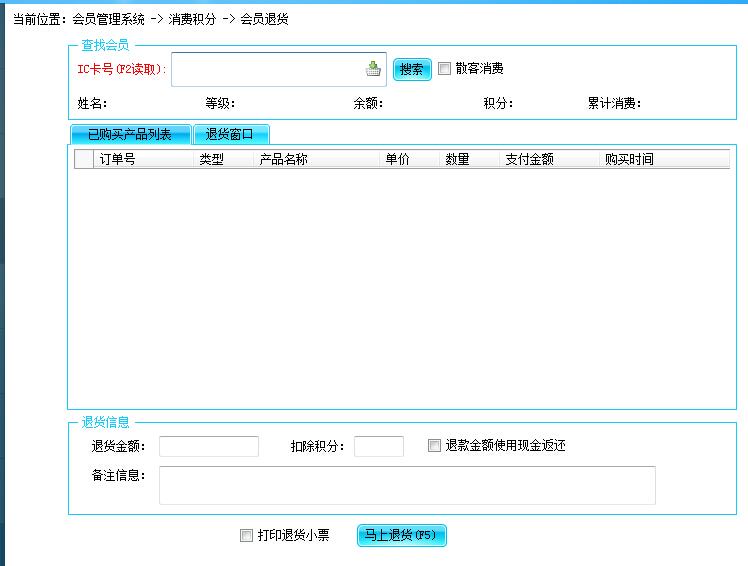 服务与支持点击“消费积分”主菜单,然后选择“会员退货”子菜单,即可调出会员退货窗口,如下图:
