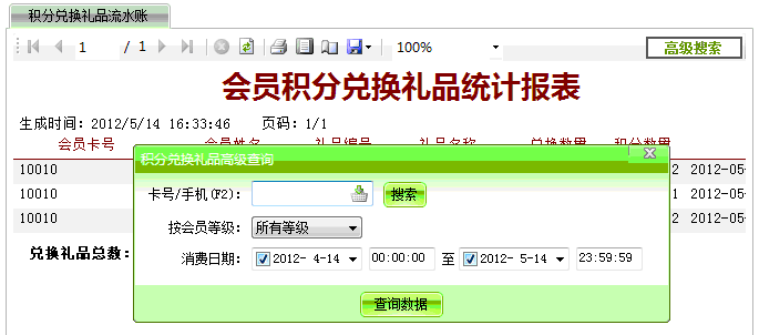 默认将全部本月礼品兑换数据统计出来,并按一定的格式显示,可以通过点击“礼品兑换高查询”按钮,筛选数据: