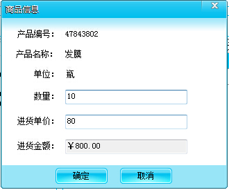 2.选择产品名称,弹出进货窗口,输入进货数量,系统会自动计算出总金额,如图: