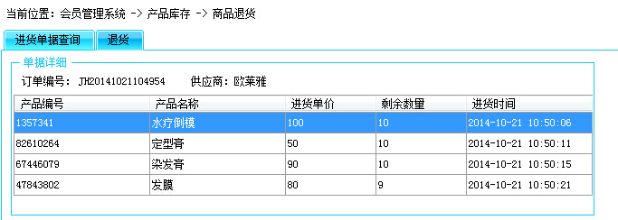 服务与支持点击“产品库存”主菜单,然后选择“产品退货”子菜单,即可调出产品退货窗口,如下图: