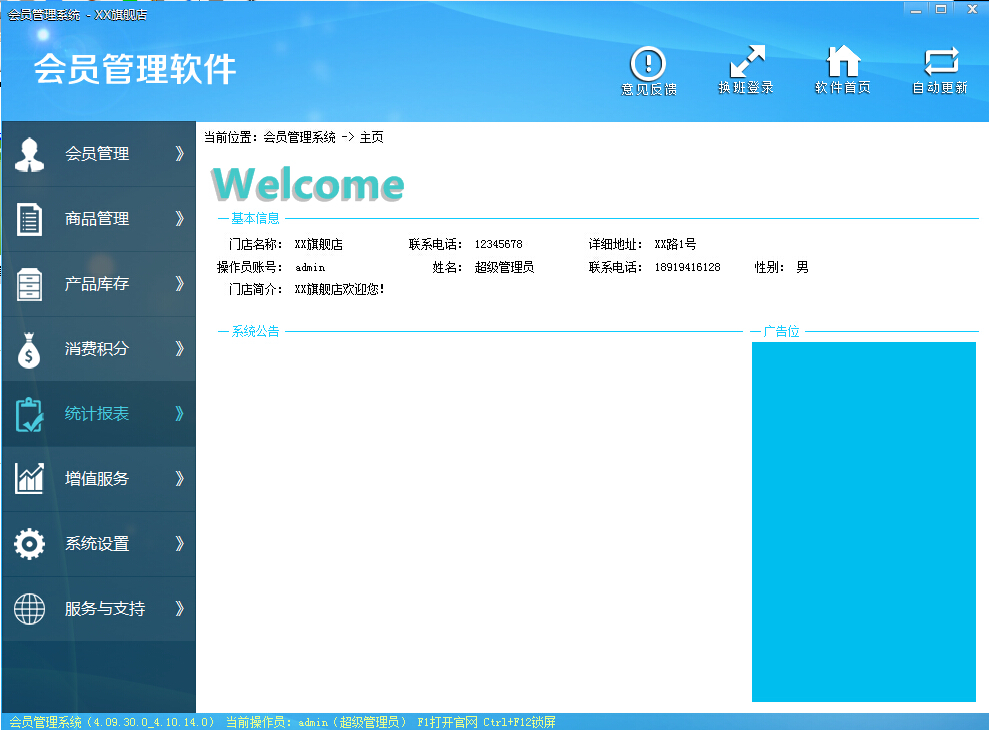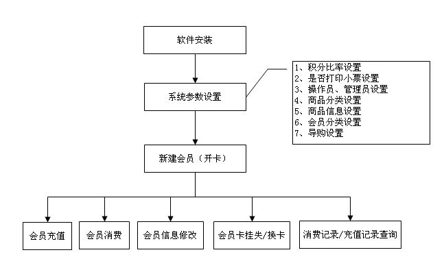 整个界面分一三个部分,一顶部一主菜单,包括会员管理、消费积分、短信群发、统计报表、系统设置和服务与支持,右侧一子菜单,点击主菜单之后会出现对应的子菜单,中间部分一实际操作区。