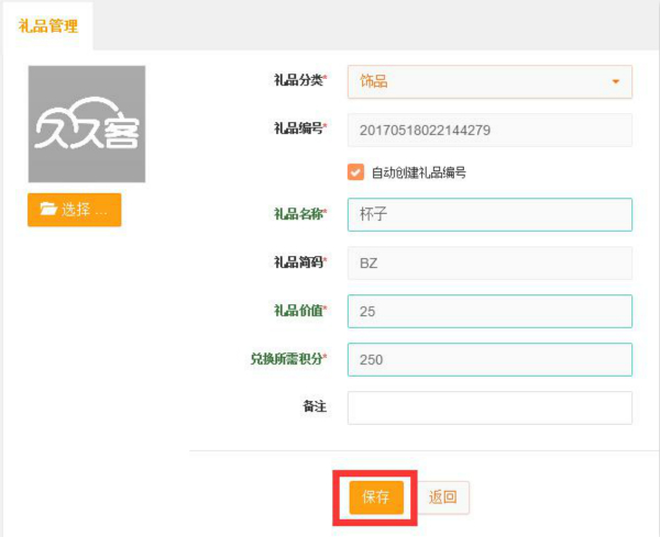(2)输入礼品信息,点击保存,礼品添加完成。如图: