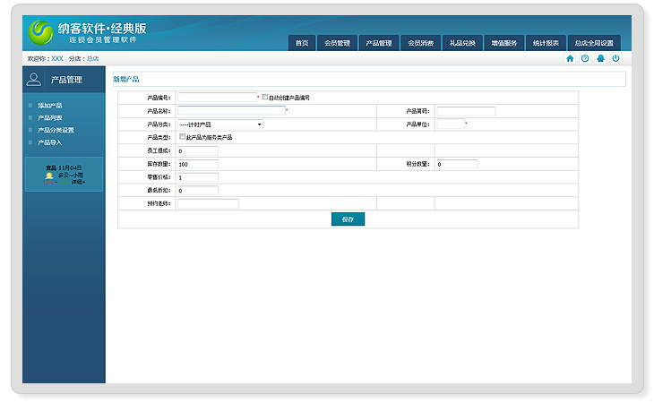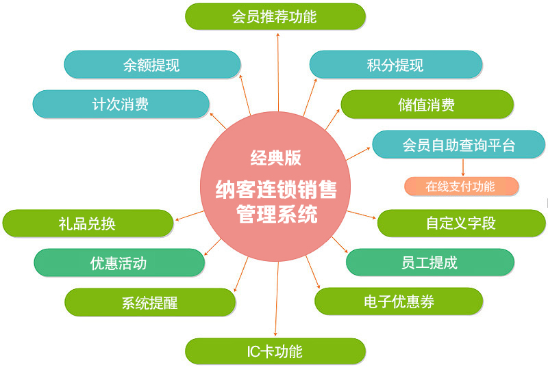 纳客连锁会员系统根据客户使用需求,提供了经典版的基本功能,满足大部分客户对连锁会员管理,产品进销存,礼品兑换,积分管理,微信会员卡,短信群发等功能。一实现更多高功能, 纳客还推出了企业版等高版,高版本包含了诸如储值消费、记次消费、优惠活动、电子券、(RMF)报表、业绩核算、员工提成、连锁店进销存、IC卡等,客户可根据自己的业务需求,选择合适自己企业需求的功能版本。