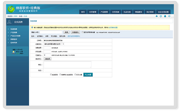 本系统一通用版管理软件,适用于餐饮、酒店、洗浴中心、足浴城、连锁加盟零售、健身中心、高尔夫俱乐部、旅游娱乐业等各行业需要实现连锁会员制管理、连锁消费管理的连锁门店、大型单店(多收银台)。